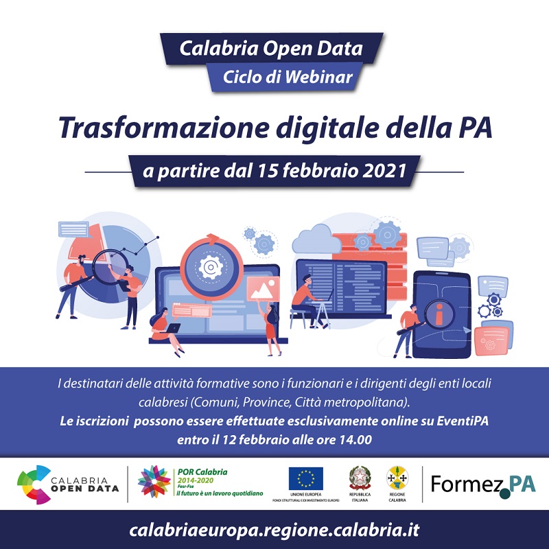 La Regione Calabria, in collaborazione con Formez PA, organizza nell'ambito del progetto strategico Calabria Open Data, due cicli di webinar sul tema dell’innovazione digitale degli enti locali, a partire dagli obblighi di trasformazione digitale (CAD e piattaforme abilitanti, SPID, IoPA, PagoPA, Carta di identità elettronica e Anagrafe Nazionale della Popolazione Residente) a cui gli enti sono chiamati ad uniformarsi. Tra i temi, la digitalizzazione dei servizi degli enti e le caratteristiche dei siti web istituzionali, la trasparenza e gli open data e la dematerializzazione documentale della PA.