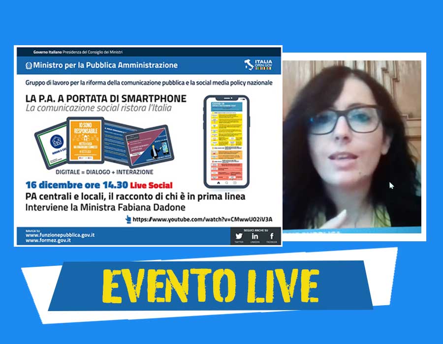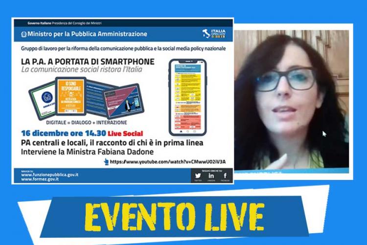 La Pa a portata di smartphone: la comunicazione social ristora l'Italia è il titolo dell' evento Live del Dipartimento della Funzione pubblica-Formez sulla Social media policy nazionale, (disponibile on demand) durante il quale PA centrali e locali hanno raccontato la loro esperienza, le scelte fatte, le criticità, le soluzioni adottate da chi è stato in prima linea nel periodo dell’emergenza, avendo come focus l’interazione con i cittadini. Il Ministro per la PA, Fabiana Dadone, dopo avere ascolato molti degli interventi, è intervenuta alla maratona social, sostenendo come sia importante introdurre energie nuove nella Pa "ma non servono soltanto giovani, bisogna anche pensare in modo giovane per spingere tutta la Pubblica Amministrazione a uscire da un certo arroccamento e a mettersi realmente dalla parte dei cittadini. In questo passaggio la comunicazione, soprattutto quella digitale, ha un ruolo fondamentale”. Riferendosi poi al ruolo dei social media nella PA a servizio del cittadino, Fabiana Dadone ha continuato dicendo che “questi nuovi strumenti di dialogo hanno un effetto di accelerazione grandissimo", sottolineando come sia giusto che la PA comunichi "nell'ottica della customer satisfaction". Infine, ha concluso auspicando come "se vogliamo permettere alla Pa di essere l'azienda traino del sistema Italia, dobbiamo prendere per le corna il toro del cambiamento per far sì che si crei un sistema virtuoso e per rafforzare quel rapporto di fiducia reciproco che, oggi più che mai, serve tra pubblica amministrazione e cittadino”.