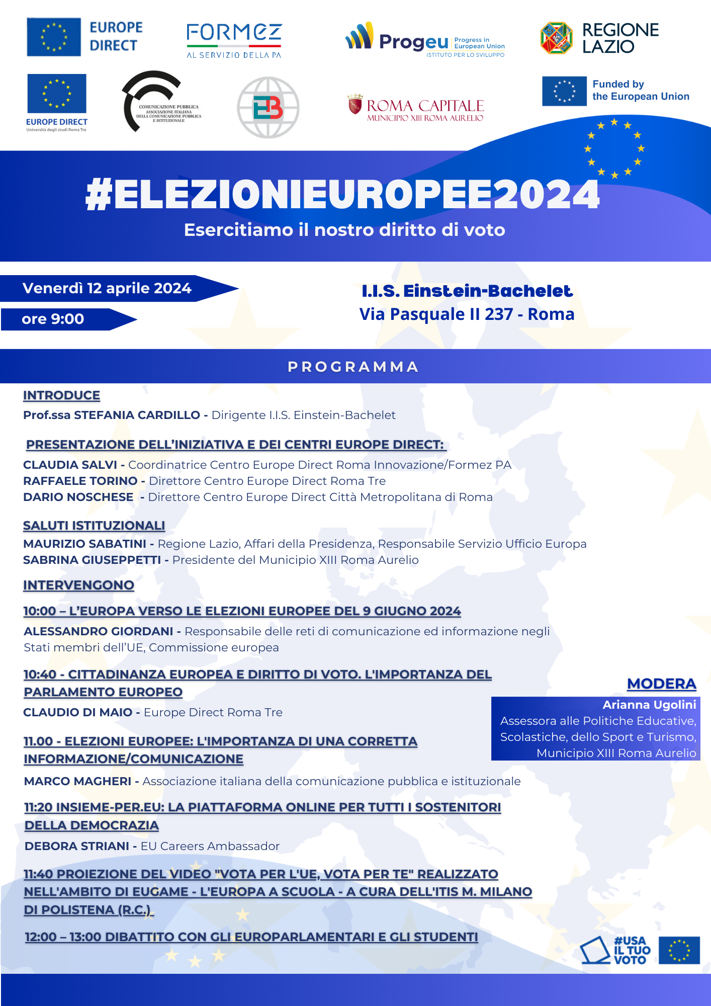 L’evento è organizzato dai Centri della rete Europe Direct Roma Innovazione operativo presso il Formez, Roma Tre e Roma Capitale, il Municipio XIII Roma Aurelio, l’I.I.S. Einstein-Bachelet, in collaborazione con l’Associazione Italiana della Comunicazione Pubblica e Istituzionale e il Servizio Ufficio Europa, Affari della Presidenza della Regione Lazio.