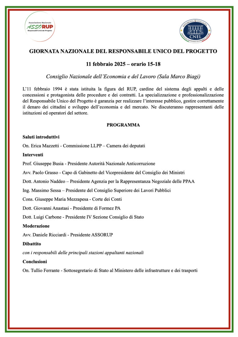 Il Presidente Formez, Giovanni Anastasi, interverrà alla Gionata nazionale del responsabile unico del progetto, che si svolgerà a Roma, l’11 febbraio, con inizio alle ore 15, presso la sede del CNEL, nella sala Marco Biagi. Ad aprire i lavori dell’evento, moderato dal Presidente di Assorup, Daniele Ricciardi, sarà Erica Mazzetti, componente della Commissione Lavori pubblici della Camera dei deputati. Fra gli altri relatori Giuseppe Busia, Presidente dell’Autorità nazionale anticorruzione, Paolo Grasso, Capo di Gabinetto del vicepresidente del Consiglio dei ministri, Antonio Naddeo, Presidente dell’Aran, Massimo Sessa, Presidente del Consiglio superiore dei lavori pubblici, Giuseppe Maria Mezzapesa, componente della Corte dei conti e Luigi Carbone, Presidente della IV sezione del Consiglio di Stato. A conclusione dei lavori l’intervento di Tullio Ferrante, sottosegretario di Stato al ministero delle Infrastrutture e trasporti. Nel corso del convegno si parlerà della figura del RUP, istituita l’11 febbraio 1994, cruciale per il sistema degli appalti e delle concessioni e ruolo centrale nei contratti e nelle procedure.