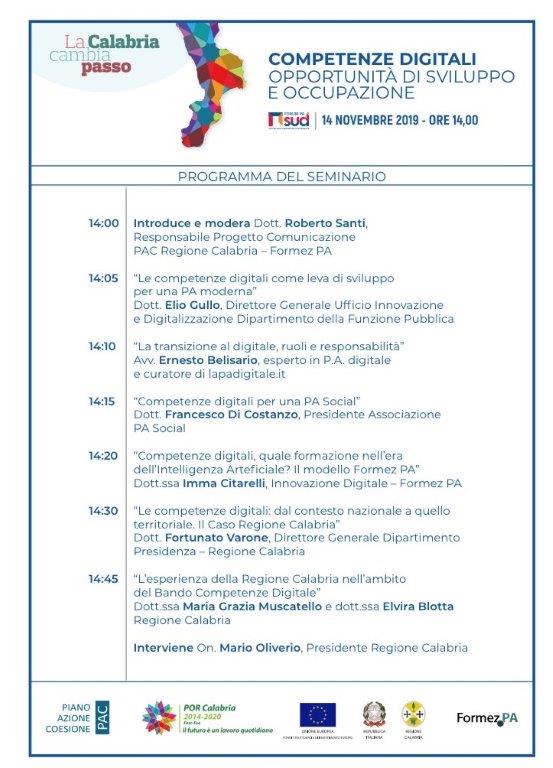 - Il 14 novembre, dalle 14.00, è previsto il seminario dedicato alle competenze digitali “Competenze digitali, opportunità di sviluppo e occupazione”, organizzato da Regione Calabria in collaborazione con Formez PA. Al seminario, moderato da Roberto Santi, responsabile del progetto di comunicazione del PAC (Piano di Azione e Coesione) di Formez PA, interverranno Elio Gullo, direttore generale dell’Ufficio Innovazione e Digitalizzazione del Dipartimento della Funzione pubblica; Ernesto Belisario, referente della rete dei responsabili per la transizione al digitale; Francesco Di Costanzo, presidente dell’associazione PA Social; Imma Citarelli, Innovazione Digitale - Formez PA. Questo primo gruppo di esperti offrirà un'analisi delle competenze digitali in Italia approfondendo le politiche dell’Agenda Digitale. Nella seconda parte del dibattito interverranno Maria Grazia Muscatello e Elvira Botta, Regione Calabria e verrà presentato il Bando “Competenze Digitali” della Regione Calabria, prima Regione ad aver indetto un Bando specifico sull’argomento: il direttore generale del Dipartimento Presidenza della Regione Calabria, Fortunato Varone, informerà nel dettaglio sul Bando che, per l’alto numero di richieste, potrebbe vedere una seconda edizione. Interviene Mario Oliverio, Presidente della Regione Calabria.
