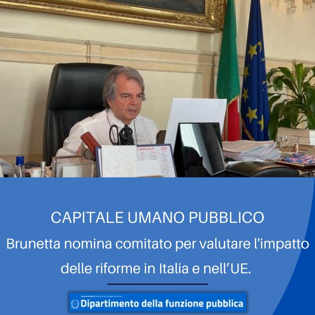 Valutare l'efficacia delle azioni e delle politiche messe in campo per selezionare e formare la classe dirigente della Pubblica amministrazione, validare i rapporti annuali che la Scuola nazionale dell'amministrazione (Sna) e Formez PA redigeranno, secondo i rispettivi ambiti di attività, e mettere a punto un’analisi sull'attuazione amministrativa dei Piani nazionali di ripresa e resilienza nei principali Paesi Ue e sui cambiamenti organizzativi indotti in Italia dal Pnrr. Sono questi i compiti del Comitato scientifico per l’impatto delle riforme in materia di capitale umano pubblico, appena istituito dal ministro per la Pubblica amministrazione, Renato Brunetta, e composto - oltre che dai presidenti di Sna, Paola Severino, e di Formez PA, Alberto Bonisoli - da Sergio Fabbrini, professore di scienza politica e relazioni internazionali alla Luiss, in qualità di presidente; Thomas Christiansen, professore di Istituzioni europee e direttore del PhD Program in Politics alla Luiss; Adrienne Heritier, professoressa emerita di “Comparative Public Policy” allo European University Institute di Fiesole (Firenze); Marc Lazar, professore di sociologia politica all’Università SciencesPo di Parigi; Bernardo Mattarella, professore di diritto amministrativo alla Luiss; Raffaella Saporito, professoressa di public management alla SDA Bocconi; Marcella Panucci, capo di gabinetto del ministro Brunetta.