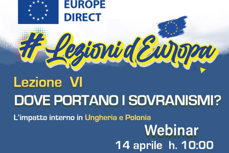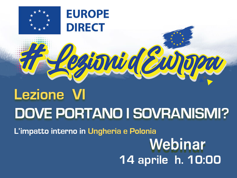 Il 14 aprile si terrà webinar Dove portano i sovranismi? L’impatto interno in Ungheria e Polonia, il sesto appuntamento del ciclo formativo Lezioni d'Europa. Un percorso che prevede 15 appuntamenti che affronteranno svariati temi quali l’europeismo e l’antieuropeismo italiano, la storia delle istituzioni europee, l’immagine dell’UE in paesi come Maghreb, Cina e Russia, l’allargamento verso i Balcani occidentali, i sovranismi di Polonia e Ungheria e il loro impatto sull’Unione. Questo, senza dimenticare argomenti come la transizione digitale, la salute, la digitalizzazione, l’intelligenza artificiale, la lotta alle “Fake news”, i fondi europei, il PNRR in Italia e l’euro progettazione, ai quali saranno dedicati specifici incontri del percorso formativo.