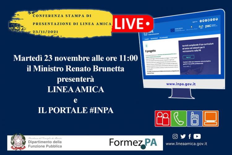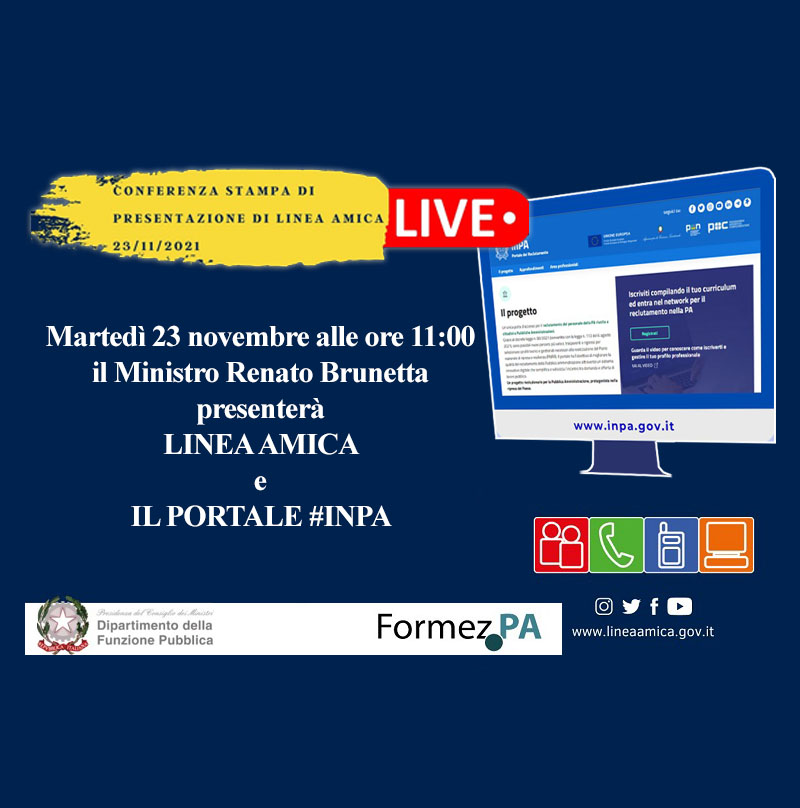 Il 23 novembre alle ore 11.00, presso la Sala Polifunzionale della Presidenza del Consiglio, si è tenuta la presentazione del nuovo Portale nazionale del reclutamento inPA e del servizio Linea Amica Digitale, alla presenza del ministro per la Pubblica amministrazione, Renato Brunetta, e dei vertici del Dipartimento della funzione pubblica e di Formez PA. Hanno portato la loro testimonianza sulla partnership attivata per inPA anche rappresentanti di LinkedIn Italia. L'evento è stato trasmesso in streaming.