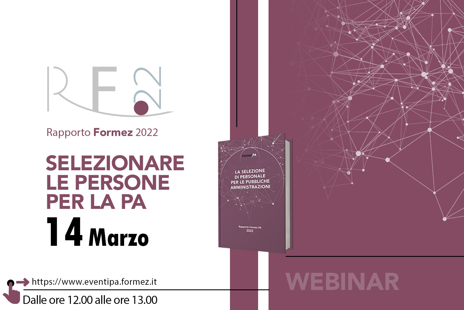 Martedì 14 marzo si terrà il webinar Selezionare le persone per la PA. Si tratta dell'ultimo dei quattro seminari online, organizzati dal Centro studi e attività internazionali per approfondire i temi affrontati nel Rapporto Formez PA 2022, presentato il 2 febbraio 2023 alla stampa.